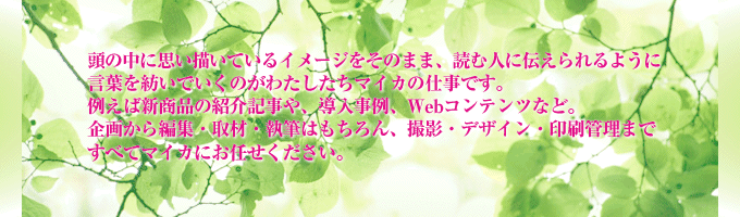 1つは、一般誌や専門誌、業界紙や新聞、広報誌、インターネットコンテンツなどの制作を請け負う編集プロダクション「オフィスマイカ」。